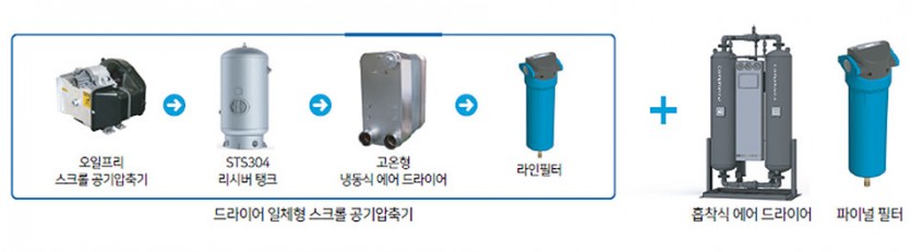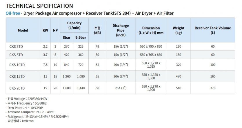 CKS-TD Series-일체형 페이지 정보 목록 답변 본문 일체형 패키지 타입 • 오일프리 스크롤 공기압축기 + 리시버탱크(STS304) + 고온형 냉동식 드라이어 +라인필터 일체형 • 쉬운 설치, 공간절감, 배관 차압방지, 설치비용 절감 • 스테인레스스틸 리시버탱크과 열교환기, 알루미늄 하우징 라인필터 적용으로 부식을 방지하여 고청정 압축공기를 생산합니다. • Dew Point 4~10℃PDP의 수분이 제거된 건조합 압축공기 공급 이전글CKS Series-스탠다드형 25.01.12